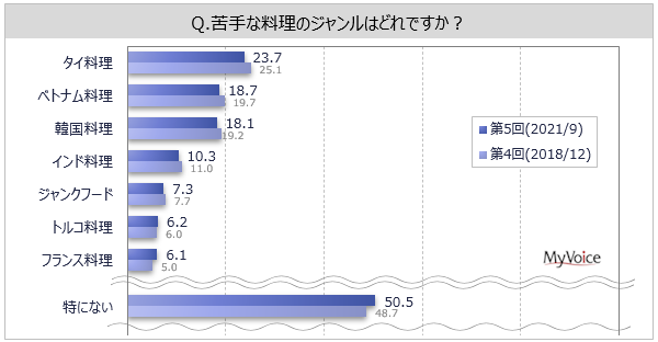 タイ料理が苦手だと回答した人は23.3%。2位以下は「ベトナム料理」(18.7%)、「韓国料理」(16.8%)、「インド料理」(9.7%)が続いた。苦手な料理がある人が回答した理由では「香辛料」「味付け」がそれぞれ回答率が40%台で目立った。「苦手な食材がある」「におい」「クセがある」もそれぞれ3割程度の回答が集まった。