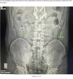 腹痛の原因について聞かれた男性は「正午頃、肛門から大きなウナギを挿入した」と答えた。医師は早速、複数の検査を行い、レントゲン検査でウナギと分かるような長い骨が男性の腹部を横切るように左から右へ伸びていることを確認した。