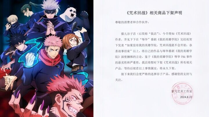 同店の声明文には「今朝、『呪術廻戦』の原作者・芥見下々氏が、反中作品『僕のヒーローアカデミア』の連載完結を祝うコメントを