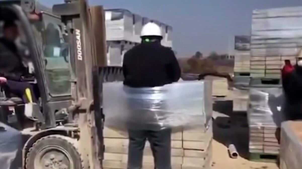 男性の左側にはフォークリフトに乗る別の人物が。