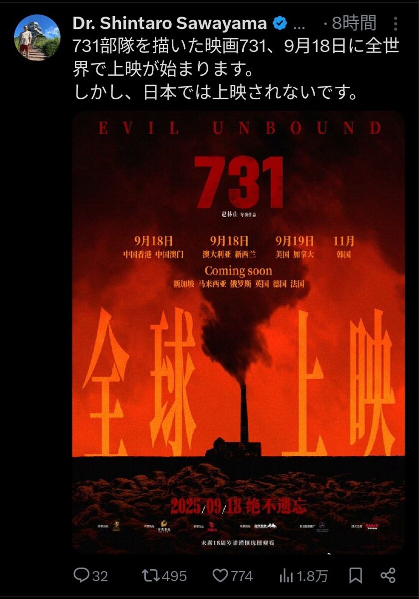 反日映画「731」が世界同時上映。731部隊の元隊員の証言や歴史が描かれ、真実を知る重要性が強調される。