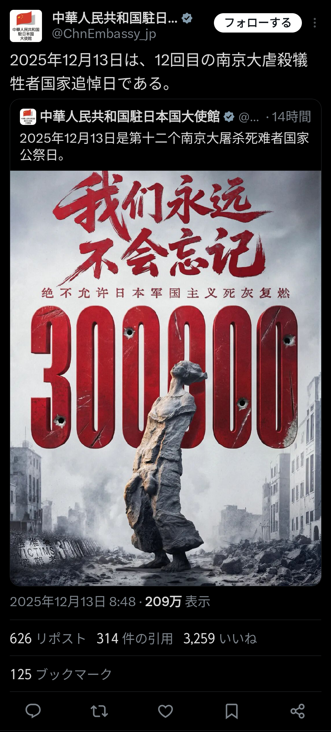 【北京共同】中国政府は13日「南京大虐殺」の追悼式典開催に合わせ、日中戦争中に