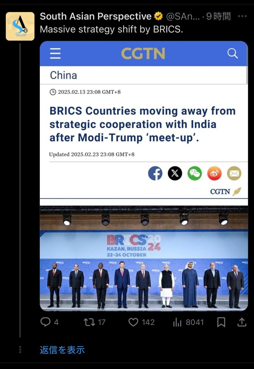 BRICSの崩壊とも言えるこの状況、インドの姿勢が波紋を呼んでいますね。