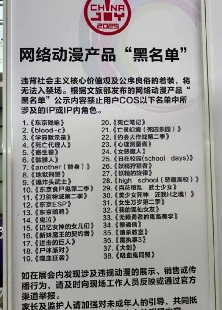 中国の「ChinaJoy 2025」で発表されたコスプレ禁止リストが議論を呼んでいる。「進撃の巨人」など多くの人気作品が禁止され、基準に疑問の声が上がった。